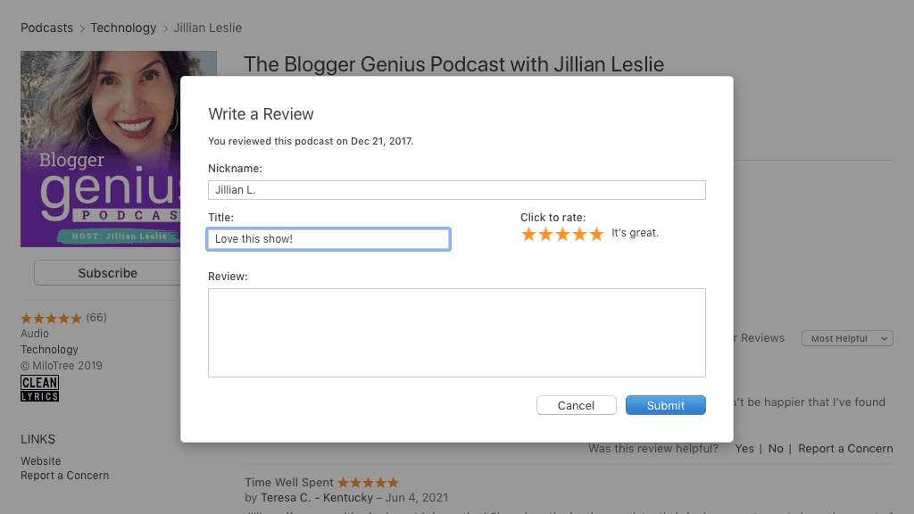I can’t tell you how much I appreciate your review! Because of you, more people can now find the show. And I might even read your review live on my next episode!