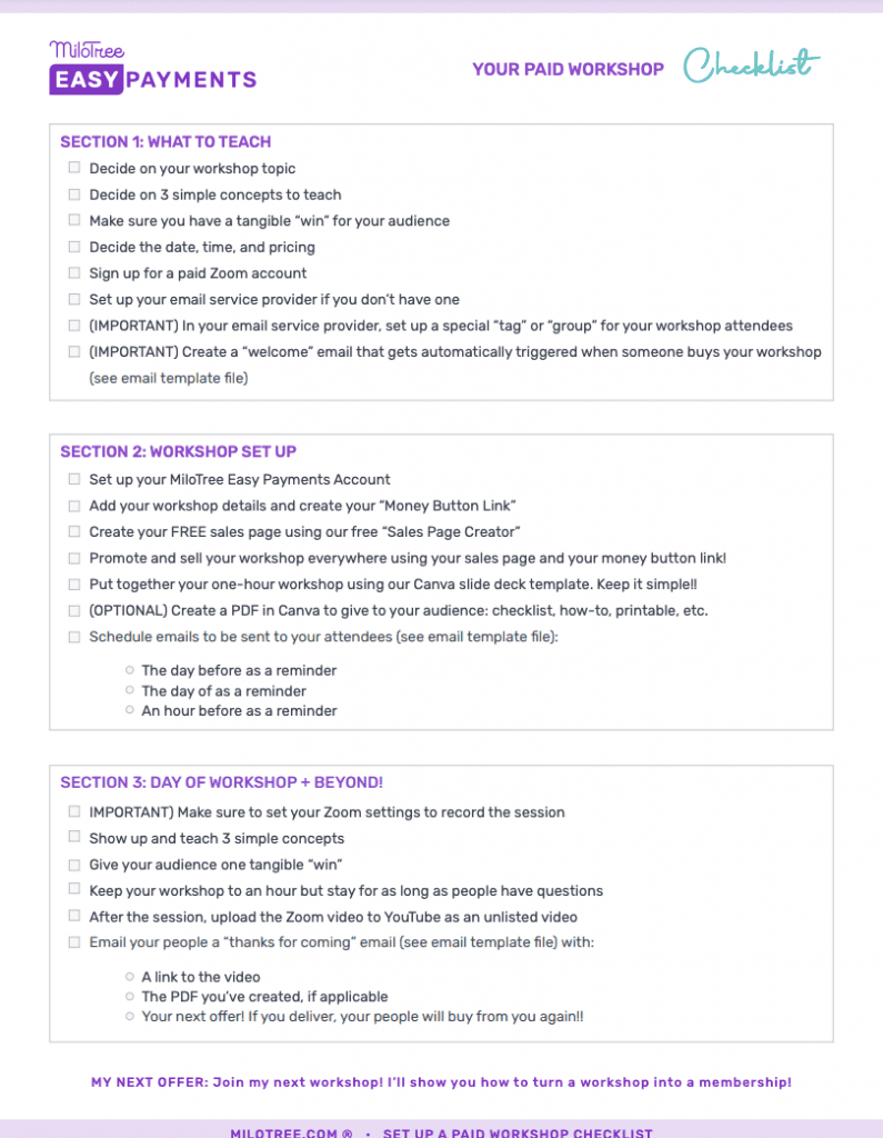 Use this easy checklist to set up your paid workshop in under 60 minutes!Brought to you by MiloTree Easy Payments!